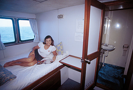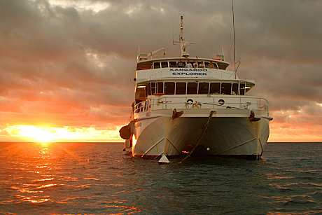 The M.V. Kangaroo Explorer is a modern 25 metre catamaran specifically designed for Queensland coastal cruising. Each of our 16 cabins (twin, double and 4-berth) is fully air-conditioned, carpeted, has its own en-suite facilities and port hole or window. On the main deck there is a spacious saloon served by a top class galley and a well stocked bar. The top deck offers an enclosed air-conditioned sun lounge as well as an open and shaded sun-deck. There is a library situated in the sun lounge for your convenience. The Kangaroo Explorer is equipped with a spacious dive deck providing easy access to and from the water.